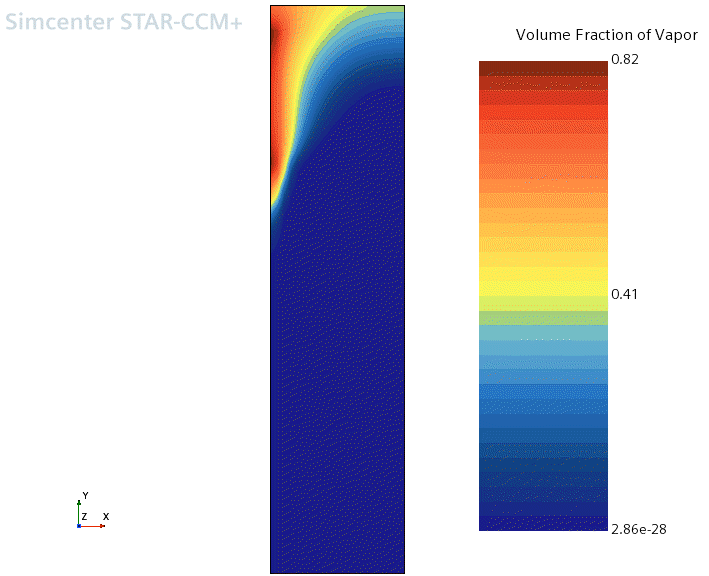 一个很小的负过冷出现在紧挨壁面处,它实际上意味着流体过热了几度。它尚未蒸发的原因是,蒸发率受到了流体和流体蒸汽交界面之间的热传递速率的限制。大多数蒸汽被局限在过冷并不太高的区域内,低于约 10 K。在其他地方,蒸汽一旦在壁面处产生便快速冷凝。在此标量场景中,蒸汽似乎迅速扩散到整个流动,但事实上它是借助于使用湍流耗散力建模的湍流速度波动扩散的。