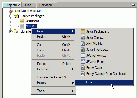 将 Java 包、Java 类和 XHTML 文件添加到模拟助手项目