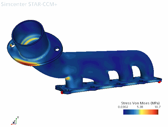 由于您应用了限制较少的约束,只为防止刚体运动,从而能使歧管自由膨胀,因此,von Mises 应力场景显示了远低于 200 MPa 屈服应力的应力。