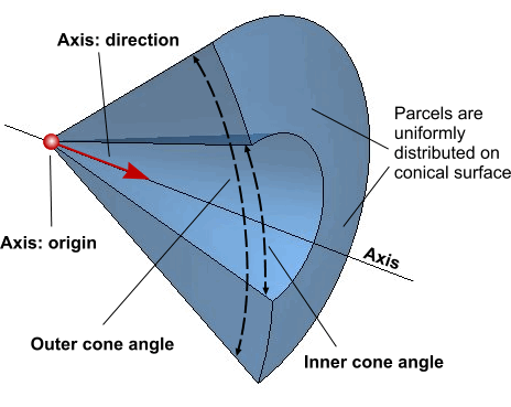 The specified number of parcel streams are injected in random directions conforming to a uniform distribution on the surface of the cone. Given the direction, the velocity is obtained using the specified velocity magnitude. In steady simulations, each iteration uses the same stochastically chosen direction and size distribution. In unsteady simulations, the direction and size distribution are randomized again and newly sampled each time-step, if you activate the Cone Randomization property. For this injector, the Inputs property is used to define the region within which the origin of the axis is located.