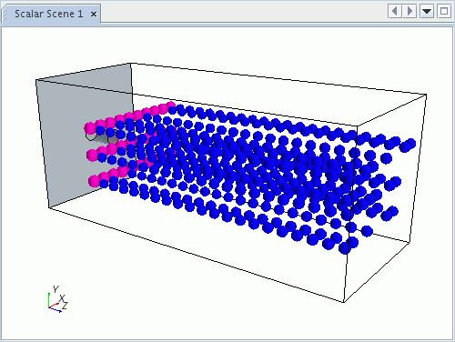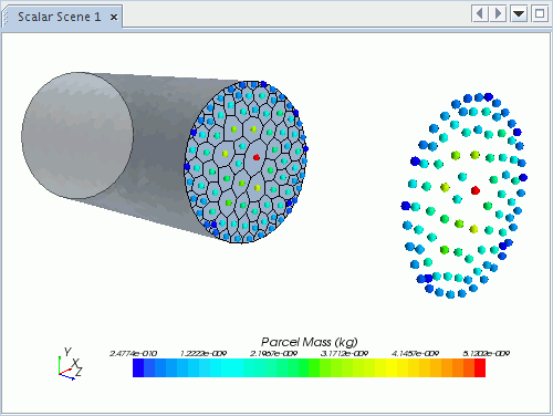 A unique feature of the surface injector type is that the injection flow rate can be defined with a flux, that is, as a rate per unit area. The final flow rate is the product of the face area and the specified flux, whether this flux is a particle, mass or volume flux. In the following example, the initial location of each parcel coincides with the centroid of each face on the starting surface. The mass of each parcel is proportional to the area of the face from which it came (as a mass flux has been specified).