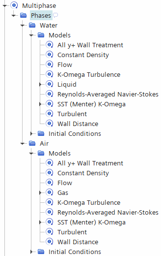流经压力水反应器测试段的两个相是空气和水。您应在欧拉多相物理模型节点下定义这些相。由于可以为约束流提供最佳结果,因此本案例使用 K-Omega 湍流模型。此外,相间相互作用使用仅兼容 K-Omega 湍流模型的界面湍流阻尼模型。