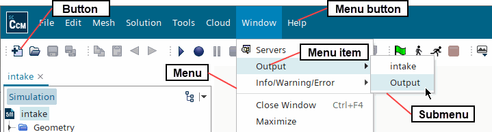 Only three windows are accessible through the Window menu: Properties, Servers, and Output. These three windows always appear as the system defaults; others, such as a named simulation window or the Graphics window, appear as a result of user actions.