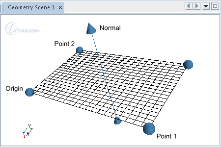 - 相对于所选坐标系指定显示网格的右下角。为点 1 输入值将自动调整法向,以便定义与当前属性匹配的网格。使用此属性和点 2 替代法向来定义平面。可以在输入中包括单位,或者在由单击