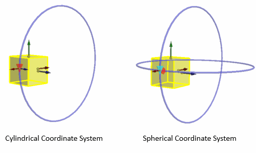 如果选择圆柱或球坐标系,小部件将与选定的坐标系对齐:- 对于圆柱坐标系,可以使用小红色箭头 (R)、大红色箭头 (θ) 和小蓝色箭头 (Z) 分别调整形状中心的径向 (R)、角度 (θ) 和轴向 (Z) 坐标。