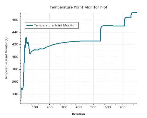 该模型会在大约四次耦合迭代后收敛,然后温度点监视器绘图显示如下。
