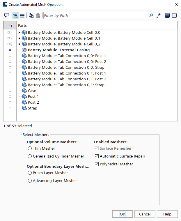在创建自动网格操作对话框中,选择电池模块:外壳,然后依次激活以下网格生成器。