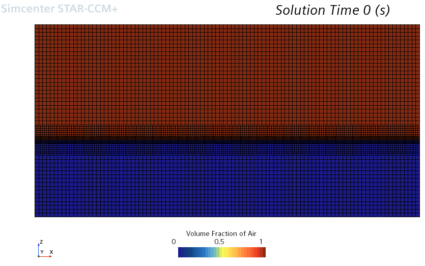 查看体积分数场景,并检查各相的初始分布和交界面处的细化网格。
