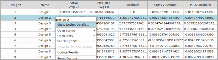 - 打开所选替代模型的残差表,其中分别显示每个设计运行的以下参数: