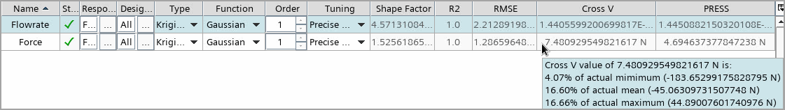将光标悬停在任何 RMSE、交叉验证或 PRESS 单元上时,值显示为通过替代模型计算的预测响应值的最小值、最大值和平均值的百分比。