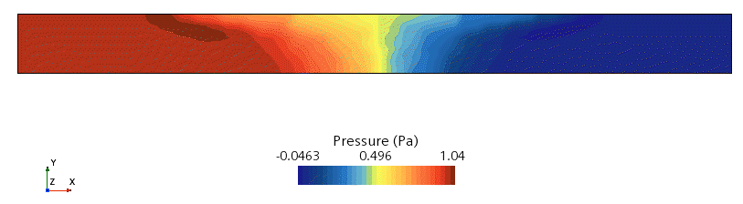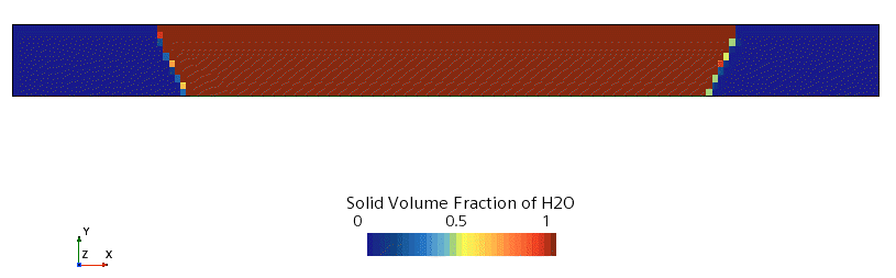 分析结果 查看和检验模拟结果。 凝固从顶壁面的中间部分开始。随着时间的推移,整个管道中的水最终凝固。 单击图形窗口中的固相体积分数。 冻结区域的速度必须为零,这是因为流体停止相对固体分数属性被设置为小于 1 的值。 单击图形窗口中的压力选项卡。 保存模拟。