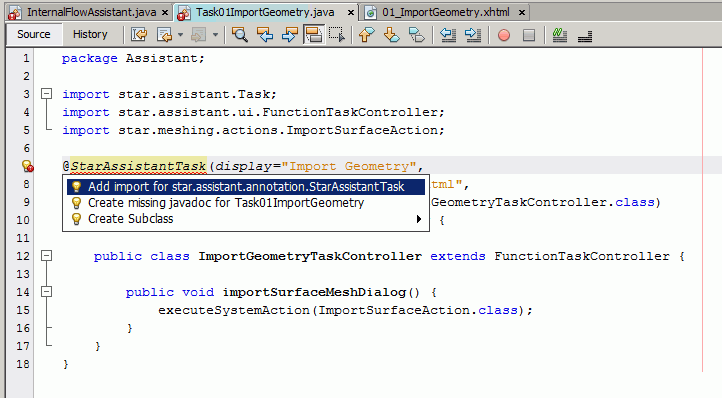 下行已添加到代码中并删除错误标记:import star.assistant.annotation.StarAssistantTask; - 选择,自动将所有缺失的导入添加到该类。