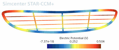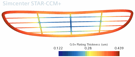 预涂层壳体内的电阻损耗和电势变化能导致靠近金属架和格栅之间接触点的铬镀层更加集中。利用此模拟进行的深入研究还包括观察铜镍壳的厚度如何影响电镀过程。壳体变薄会导致整个壳体的电势值变化幅度更大,这会影响在壳表面形成镀层的铬总量。为消除不稳定性问题,可在求解器设置中修改电势初始条件和/或减小电势的亚松弛因子。