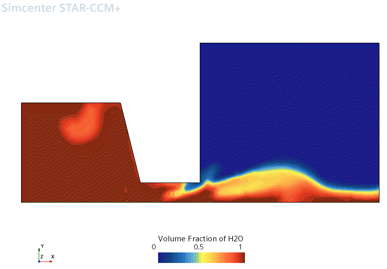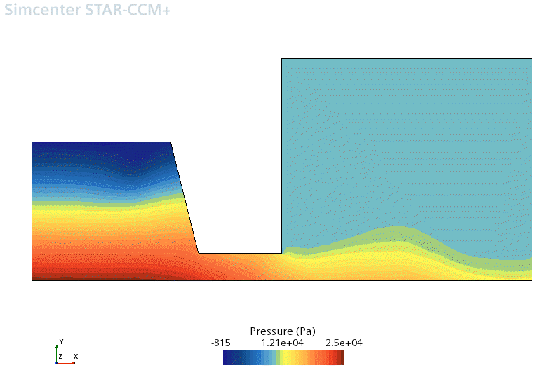 可视化结果 查看模拟结果。 在运行 5.0 s 结束时,标量场景 1 屏幕显示水体积分数分布。 要显示压力分布: 右键单击屏幕的标量条。 在下拉菜单中选择压力。 下面的截图显示右腔室内的空气压缩状态。 保存模拟。