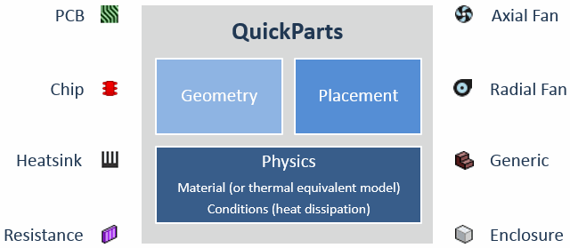 Electronics Cooling Toolset的主要功能是提供快速零部件。快速零部件可用于以有效且紧凑的方式定义组件的几何、放置和物理。快速零部件适用于最常见的电子设备组件,例如:PCB、芯片、散热器或风扇。几何模板可用于构建这些组件,而无需外部 CAD 工具。此外,互动标注和定位功能可减少组件设计和布局所花的时间。使用快速零部件库可恢复先前保存的快速零部件。