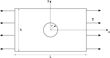 研究案例是承受轴向负载的矩形板。板的中心圆孔会引起应力集中。板处于平面应力状态,因此垂直于板的应力为零。