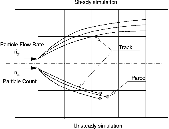 在稳态模拟中,该方法可分类为轨线方法 [655]。 求解通常是粒子束的轨迹,以及沿轨迹的状态变化(速度、温度等)。 每个轨迹将记录一个粒子束从喷射开始到离开域为止的整个生命周期。 沿每个轨迹的颗粒流率是其状态的一部分。
