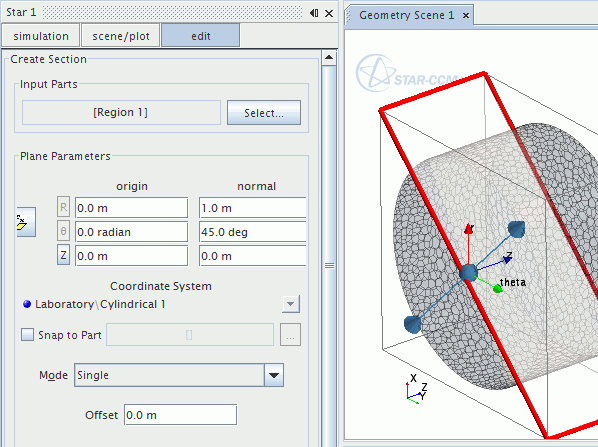 如果使用圆柱坐标系创建平面截面,指定 r、 和 z 坐标。生成的法向矢量由 r 方向(圆柱体半径)、z 方向(圆柱体长度)和 (绕 z 轴旋转的角度)组成。平面截面垂直于法向。
