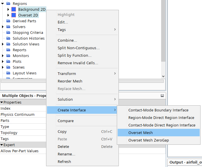 通常,可在生成背景和重叠网格前创建此界面。要激活此界面功能,必须生成物理连续体。当前执行要求背景和重叠区域使用相同的物理连续体。在本教程中,可在将网格转换为 2D 后创建重叠网格,因为此步骤会删除之前创建的所有界面。