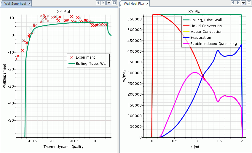 壁面过热最初为负(低于沸点),但是随着壁面能量的上升而上升,并且就在 200 次迭代时实现满动力之前变为正值。在此期间,整个热流量仅引导至液体。在达到沸点后,蒸发热流量将占去施加的一部分壁面热流量。随着计算的继续,由于脱离的气泡所造成的液体搅动或混合,沸腾区域中的液体对流被替换为淬火热流量。在核态沸腾期间,蒸发(潜热)和淬火(搅动)是加强热传递的主要因素。