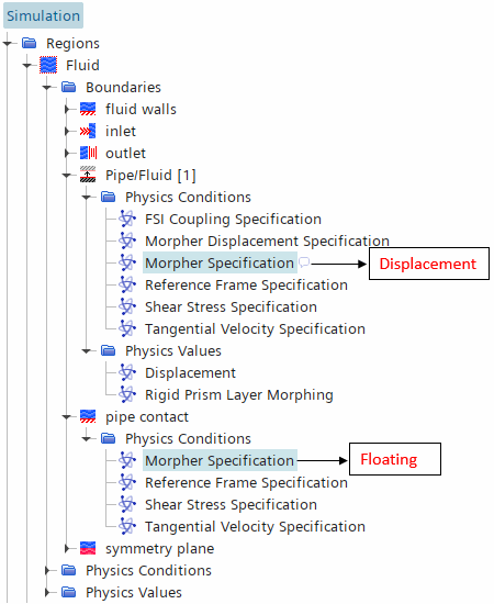 [Fluid Region] Motion [Solid Region] Motion Scenario Stationary or Prescribed Rigid Motion Stationary or Prescribed Rigid Motions Any simulation where you neglect the effects of the structure on the fluid. The rigid motions of the fluid and solid regions must be consistent. Morphing Stationary or Prescribed Rigid Motions Any simulation which neglect the effect of the structural deformation on the fluid, but takes into account the effect of any rigid motion of the structure. Morphing Solid Displacement+ any prescribed rigid motions Any simulation that takes into account the effects of the solid deformation on the fluid. This includes both one-way structure-to-fluid problems and two-way coupled problems. - For the solid region, you can define it as