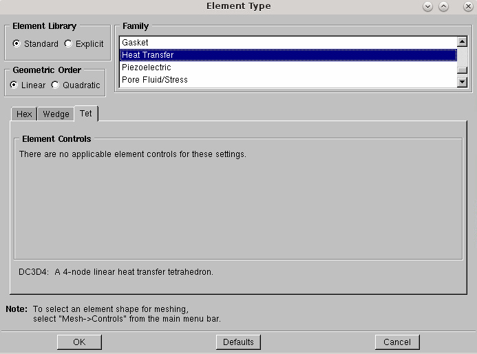 属性 设置 单元库 标准(默认) 几何顺序 线性 系列 热传递 默认情况下,选择四面体选项卡。单元选择 DC3D4 显示在对话框的底部。