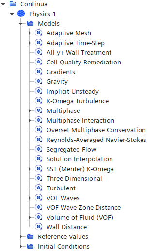 此模拟使用流体体积 (VOF) 模型对同一连续体中的空气和水建模。由于流体处于不同的相中,因此激活欧拉多相模型,并使用重力模型以顾及重力对水、空气和船体的影响。由于波传播和流体与船体的相互作用,流动为湍流。要在求解器运行时以迭代方式细化网格,则包含“自适应网格细化”和“自适应时间步”模型。