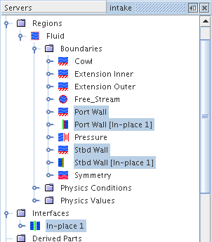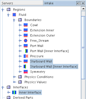 例如,在以下屏幕截图中,选定节点分别是交界面及其原始边界,以及与该交界面一起创建的交界面类型边界。 每个交界面类型边界的默认名称均包含其各自区域中的原始边界以及该交界面的默认名称。