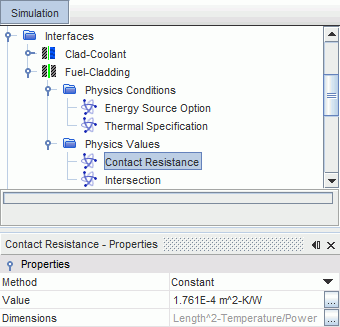 设置燃料包覆层交界面属性 定义燃料包覆层交界面接触热阻。 您设置燃料包覆层交界面接触热阻,该热阻为两个区域间的间隙建模。 设置燃料包覆层交界面属性: 选择界面 > 燃料包覆层 > 物理值 > 接触阻力节点,然后将值设置为 1.761E-4 m^2-K/W。 保存模拟。