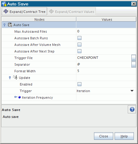 停用保存、另存为... 和保存全部命令时,此选项可让 Simcenter STAR-CCM+ 在运行期间按固定间隔自动保存模拟。 自动保存功能还适用于从计算机系统崩溃中恢复或在预先确定的时间保存瞬态分析。 本节介绍自动保存对话框的属性。