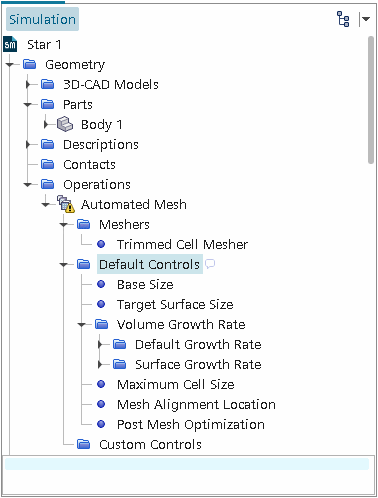 设置切割体单元网格生成器默认控制 默认控制是切割体单元网格生成器的全局级别控制。以下参考值适用于切割体单元网格生成器: 基础尺寸 最大网格单元尺寸 网格定位位置 目标表面尺寸 体积增长率 这些选项可以在模拟树的默认控制节点中设置: