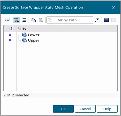 在创建包面自动网格操作对话框中,选择下和上零部件,然后单击确定。