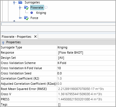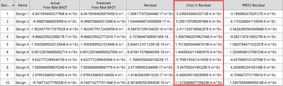 对于替代模型类型克里金和 RBF,将使用交叉验证和 PRESS 残差值判断替代模型预测精度。由于替代模型函数的结构定义了已知数据的精确拟合,因此相关性系数 (R2) 和调整的相关性系数 (R2adj) 自然等于 1。另请参见:克里金、径向基函数和交叉验证。