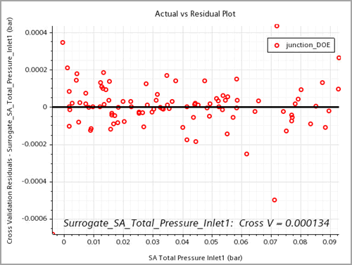 要评估替代模型函数与未知数据的拟合程度,对替代模型执行交叉验证,以评估其在整个设计空间的预测可靠性。对于每个响应,评估残差表中的交叉验证残差。还可以创建实际与残差关系绘图以将残差可视化。由于交叉验证方案具有随机性,建议多次执行交叉验证。