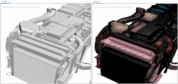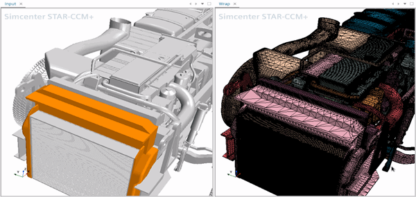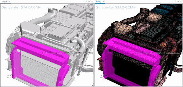 散热器罩体(上图中显示为紫色的组件)的分辨率低下,较大的网格单元显示在罩体的角部分附近。