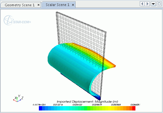 可以根据导入的位移数据使 CAE 模型变形。 此过程通过在每个表面节点上应用位移数据,使 CAE 模型网格变形。 这可用于查看 Simcenter STAR-CCM+ 中 CAE 模型的变形形状。 也可在标量场景内的变形模型上显示标量。