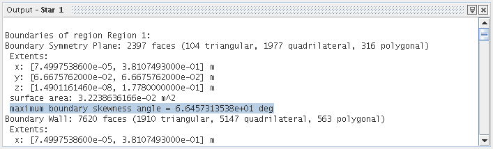 滚动浏览报告,并查找任何大于 的 Maximum interior skewness angle(最大内部偏斜角) 和 Maximum boundary skewness angle(最大边界偏斜角) 值。 如果找到任何大偏斜角,则在采取校正操作之前标识并可视化这些坏网格单元。