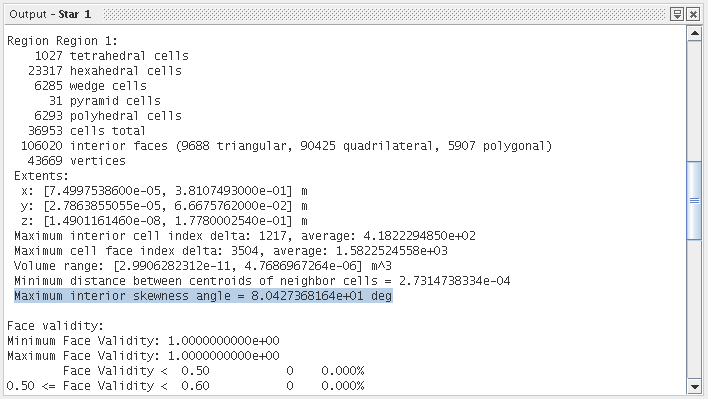 要查看最大偏斜角,使用完整的报告类型选项运行网格诊断报告。 系统将报告每个网格区域的网格单元偏斜角: