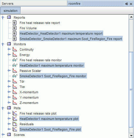 此外,还会为每个探测器创建报告、监视器和绘图。这些内容分别显示在报告、监视器和绘图节点的对象树中。