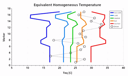 等效均匀温度绘图显示大多数段处于热或过热范围内。尤其是左臂和肩部段(标记为 12 和 13)正在逼近过热屏障。右小腿正在逼近过冷屏障。