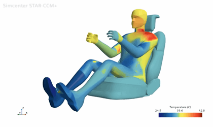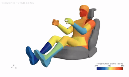 从皮肤温度来看,坐姿下的大部分身体都在 37.5°C 左右(人体温度)。当您移动到下半身尤其是脚部时,皮肤温度会降低多达 10°C。造成该情况的原因是,驾驶室热环境在给定的输入条件下呈现为不均匀和动态的环境。因此,控制脚和腿周围的气流应该可以改善整体热舒适性求解。