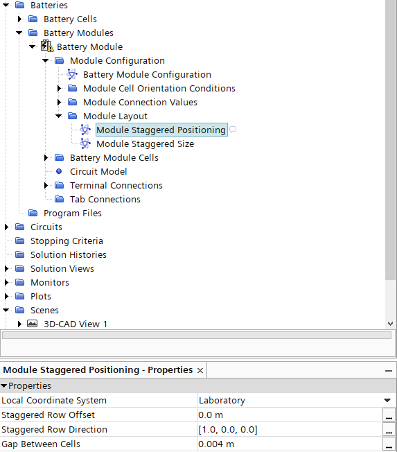 在模块交错定位 - 属性窗口中,将电芯之间的间隙设置为 0.004 m。