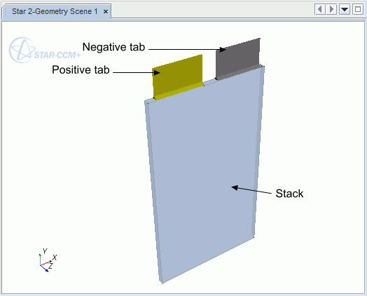 - 对于 3D 层叠电芯,该模型仅包括叠片和极耳。在 Simcenter STAR-CCM+ 中,电芯中所有正电极的极耳集合均称为电池电芯的正极耳。同样地,所有负电极的负极耳集合均称为电池电芯的负极耳。以下屏幕截图显示了 Simcenter STAR-CCM+ 中的单个电池电芯的示例。