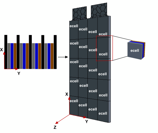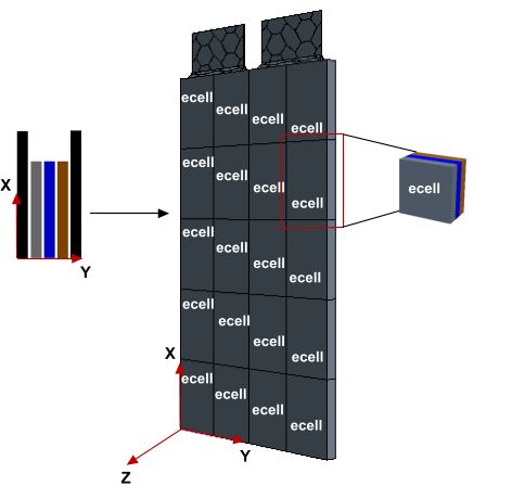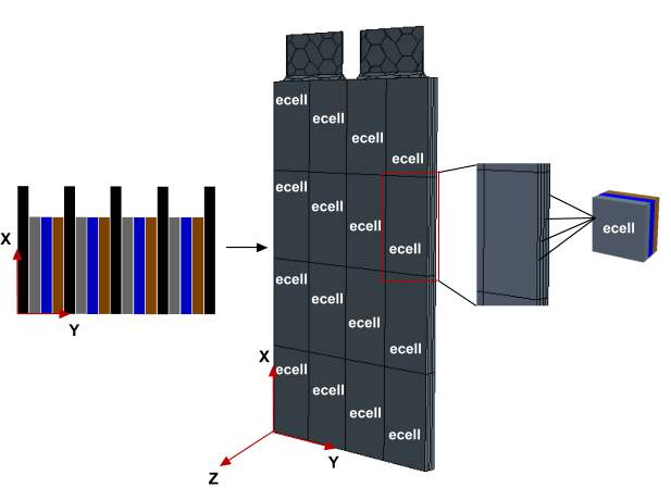- 电芯模型定义 3D 电池电芯上的结构化电气网格,并用于在 Simcenter STAR-CCM+ 中运行电池建模过程的电气求解器部分。对于 0D 电芯,整个电芯体积建模为单个电芯模型。没有内部电气网格。对于每个电芯模型,电气求解器采用一维电池模型计算电压作为时间、电流和温度的函数。