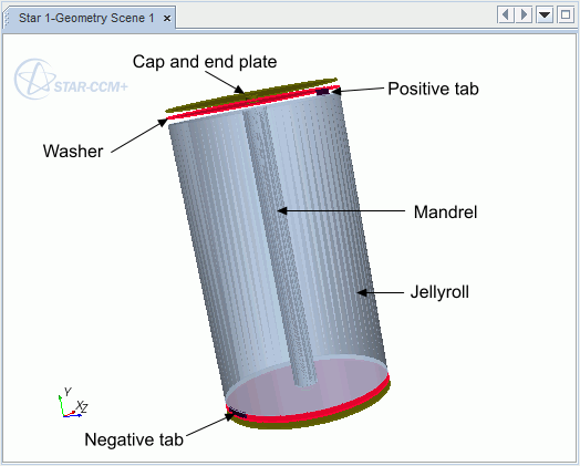 - 对于 3D 圆柱螺旋电芯,该模型包括由正负电极组成的卷芯。卷芯绕在圆柱芯棒上。此外,还会导入正负极极耳、将所有极耳接合在一起的垫片、将垫片连接至实际接线柱的帽(内部接线柱)以及封装电池电芯的外壳和端板。以下屏幕截图显示了 Simcenter STAR-CCM+ 中的单个电池电芯的示例。要显示内部部件,可以隐藏外壳。