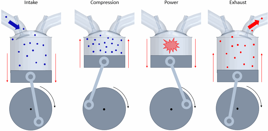 四冲程发动机是指曲轴转动两次时活塞完成四冲程。进气阀通过进气口调节空气-燃料混合物的流入;同样,排气阀通过排气口调节燃烧气体的流出。