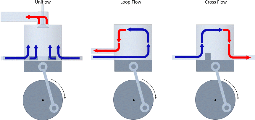 - 交叉流发动机的进气口和排气口位于气缸的两侧。活塞顶部的偏转器会向上引导进入补给,并将废气向下从排气口推出。