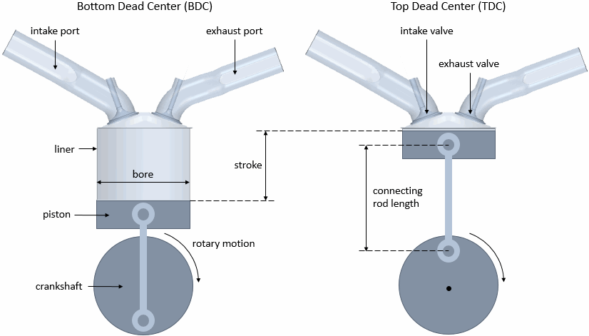 在往复式内燃机中,活塞上下移动,将因燃烧引起的气体膨胀转换为旋转运动。曲柄机制将活塞的线性运动通过连杆传输到旋转轴。活塞处于其最低点的位置称为下死点 (BDC)。当活塞处于其最高点的位置为上死点 (TDC)。