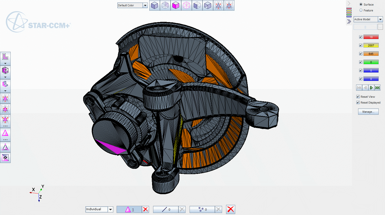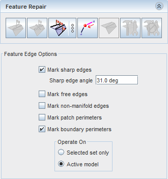 表面修复工具的功能包含在表面修复环境内。修复工具模式显示在表面修复面板中;显示、选择和诊断/搜索功能嵌入在图形窗口内。