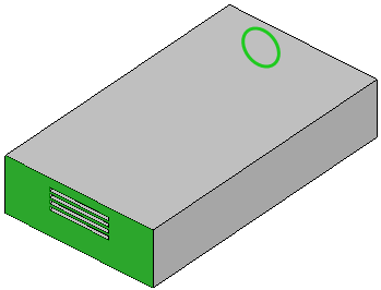 - 对于包含进出孔(如开放外壳)的快速零部件,指定在图形窗口中以互动方式选择的入口/出口边或面。 选择边时,指定孔的确切位置。 选择面时,电子设备冷却模块会分析它是否存在任何孔。 以下示例显示用于抽取体积和开放外壳的有效边/面选择: